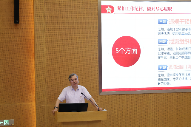 6月19日下午,副校长孔令义在江宁校区经管文楼111报告厅为h动画 作《紧扣“六大纪律”,推动党纪学习教育走深走实》的专题党课。h动画 教职工党员参加学习。