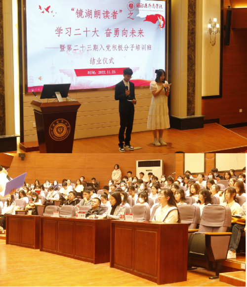 11月25日晚,h动画 在江宁校区经管文楼111报告厅举办镜湖朗读者之“学习二十大,奋勇向未来”暨第二十三期入党积极分子培训班结业仪式。学院党委书记丁素军及培训班全体学员参加此次活动。