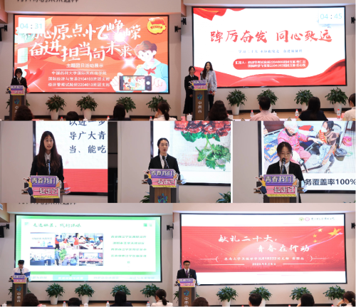展示过程中,我校国际医药商学院5支队伍分别以《继坚韧不拔之勇 创笃行不怠之功》《信仰点亮青春 笃行成就梦想》《青春向党沐风雨 杨帆追梦砥砺行》《初心原点忆峥嵘 担当奋进向未来》《踔厉奋发 同心致远》为题进行展示,东南大学吴健雄学院以《献礼二十大,青春在行动》为题、南京航空航天大学计算机科学与技术学院以《垃圾+创意=宝藏”改造计划》为题、河海大学大禹学院以《少年奋进无遗力,继往开来义不辞》为题进行分享。各支部立足青年视角,以微团课、手绘长卷、实践服务、视频创作、情景剧演绎、参观红色教育基地等丰富多彩的形式,生动阐述了新时代青年要发扬“功成不必在我、功成必定有我”的责任感和使命感,践行“请党放心,强国有我”的铮铮誓言和行动自觉,现场气氛热烈、掌声不断。