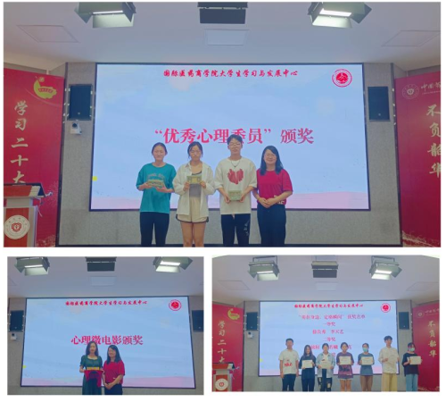 学发中心学习部部长鲍俐彤首先就“不一样的21天”大学生习惯养成活动的开展情况做了总结。本次习惯养成活动分为学习部分、运动部分、阅读部分三个部分,孙军老师、王锦涛老师、周洁老师分别为三个部分设置的“单词达人奖”“墨香书韵书法奖”“青春活力奖”“最美读书笔记奖”等奖项的获奖同学进行了颁奖。随后,学发中心心育部副部姚芊宁就本学期开展的心理微电影大赛、“喜迎春,画世界”绘画等心理活动作了简要总结,赵瑾老师为心理微电影获奖代表、“优秀心理委员”获奖代表颁奖。最后,学院党委副书记杨庆老师为学发中心优秀部长、干事颁奖。