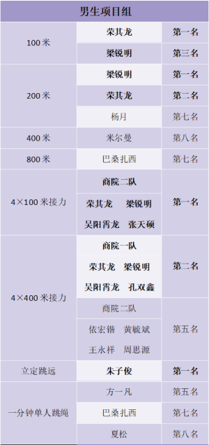 商学院运动健儿们奋勇拼搏,在各项赛事中斩获众多奖项。他们为药大而战、为商院而战、为荣誉而战,不断向更高的目标奋进。h动画 院部总分、男子团体总分、女子团体总分最均获得第三名的成绩。商院师生用拼搏与汗水为自己定格下热血青春里的闪耀瞬间,将努力与奋斗为每一次勇敢的挑战画下圆满的句点。